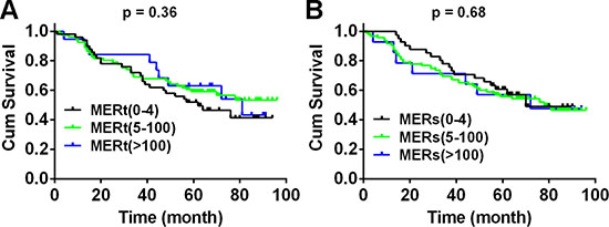 Figure 3: Mer expression is not correlated with overall survival of patients with NSCLC. Kaplan–Meier curves for overall survival of 150 NSLCC patients according to the Mer expression level in tumoral and stromal compartments over a median 60.5-month follow up period after initial surgery. Due to few cases with H-score of Mer at 101–200 and 201–300, we integrated these two groups into one group (Mer > 100). The results for unintegrated groups were shown in Supplementary Fig. 3A.