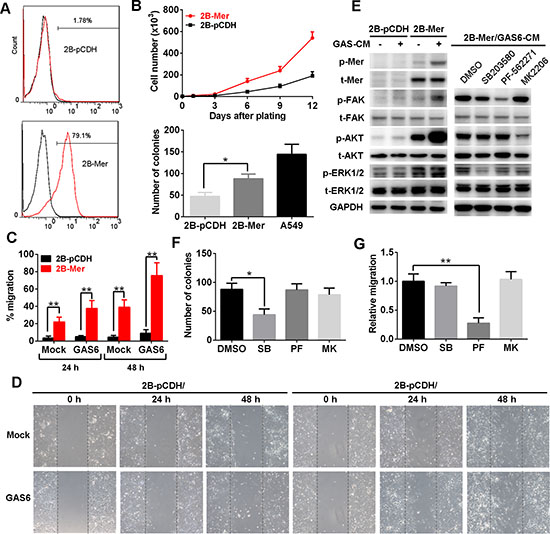Figure 4: Mer overexpression promotes the proliferation and migration of normal lung epithelial cells. A. Mer expression in BEAS2B cells stably transfected with control (2B-pCDH) or Mer-carried lentivirus (2B-Mer) determined by flow cytometry. B. Proliferation and clonogenic colony formation assays. BEAS2B cells stably expressing control (2B-pCDH) or Mer (2B-Mer) were plated in 6-well plates and cultured for 12 days or 10 days, and cell counts were performed every 3days (upper) or colony numbers were determined at the end of experiments (bottom). C and D. Migration assays. BEAS2B cells stably expressing control (2B-pCDH) or Mer (2B-Mer) were plated on 6-well plates where wounds were made using a pipette tip and cell migration into wounds were monitored at 24 and 48 h after wounding in the presence of 20% (v/v) mock or GAS6 contained CM. The representative photographs taken immediately (0 h) and 24 and 48 h after wounding were shown in D. E. Left, the activation of Mer and its downstream signals was determined by western blotting using antibodies specific for total (t) and phosphorylated (p) proteins in BEAS2B cells stably expressing control (2B-pCDH) or Mer (2B-Mer) cultured in the presence of 20% (v/v) mock or GAS6 contained CM. Right, blockade of signaling pathway activity downstream of Mer activation in 2B-Mer cells treated with the corresponding signal inhibitors. Blots representative of three independent experiments were shown. F. Clonogenic colony formation from 2B-Mer cells cultured in the presence of the corresponding inhibitors for MAPK (SB203580, 1 μM), FAK (PF-562271, 1 μM)) and AKT (MK2206, 4 μM)) signals with DMSO treatment as controls. G. Relative cell migration of 2B-Mer cells 48 h after wounding in the presence of the corresponding inhibitors for AKT, MAPK and FAK signals with DMSO treatment as controls. All data are expressed as mean ± SD of triplicates and representative of three independent experiments. *p < 0.05, **p < 0.01, paired student t test (for C) or ANOVA followed by Tukey’s multiple comparisons test (for B, F and G).