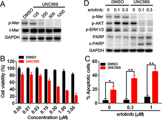 Figure 6: Mer inhibition rescues the sensitivity of NSCLC cells to erlotinib treatment. A. H1965 cells were treated with Mer-specific inhibitor UNC569 at indicated concentrations for 12 h and Mer phosphorylation was determined by western blotting. B. H1965 cells were pretreated with Mer-specific inhibitor UNC569 or vehicle control (DMSO) for 12 h followed by incubation with serially diluted concentrations of erlotinib for 72 h, and cell viability was evaluated by MTT assay. All data were normalized to the control of DMSO treatment. (C and D) H1965 cells were pretreated with Mer-specific inhibitor UNC569 or vehicle control (DMSO) for 12 h followed by incubation with erlotinib at indicated concentrations for 24 h. Cell apoptosis was determined by Annexin V/7AAD staining C. and Mer-related signaling pathway and PARP cleavage were evaluated by western blotting D. Blots representative of three independent experiments were shown. All data are expressed as mean ± SD of triplicates and representative of three independent experiments. *p < 0.05, **p < 0.01, paired student t test (for C).