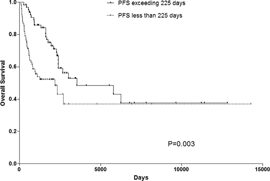 PFS and OS curves were estimated using the Kaplan-Meier method. PFS was calculated from the date of initial diagnosis to the time of metastasis diagnosis, and OS from the date of initial diagnosis to the time of death reported. Risk factors of PFS and OS were assessed by univariate analysis with log rank test and multivariate analysis with Cox proportional hazards regression. Multivariate analysis was performed using Cox proportional hazard model. Cut-off value of PFS was established by the receiver operating characteristic (ROC) curve statistical analyses. All models for survival analyses were adjusted for age at diagnosis. P < 0.05 was considered to be significant in all statistical analyses. Data analysis was performed using SPSS 18.0 (PASW Statistics 18) for Windows (SPSS Inc, Chicago, IL).