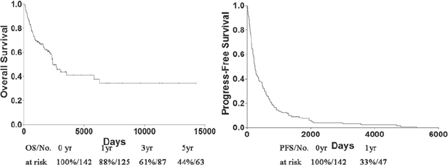 This study was approved by the institutional review board of Sun Yat-sen University Cancer Center (SYSUCC) and informed consent was obtained from each participant. Chart review was performed on 154 consecutive patients who suffered from STS with metastases between July 1965 and May 2013. Only patients with metastatic STS were included in current study, whereas those with osteosarcoma were not. Under these criteria, 142 of the 154 patients were enrolled in the final analysis. 12 patients with STS were excluded from analysis because of incomplete records. Characteristics of patients and tumors at initial diagnosis of STS and development of metastases were collected and tested for relationships with progress free survival (PFS) and overall survival (OS). The following factors were studied: patient age, sex (male vs. female), primary tumor size, and tumor depth (superficial vs. deep) at diagnosis. WHO classification [20] was used for determination of pathological diagnosis and tumor grade. All data were reviewed and confirmed by two independent pathologists.