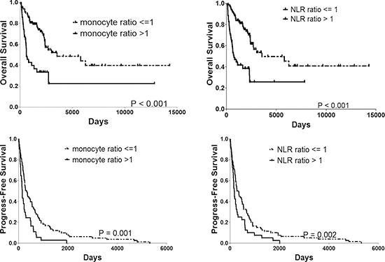 Figure 3: OS and PFS rate of patients with monocyte ratio > 1 vs. <= 1 and NLR ratio > 1 vs. <= 1. PFS progress-free survival, OS overall survival.