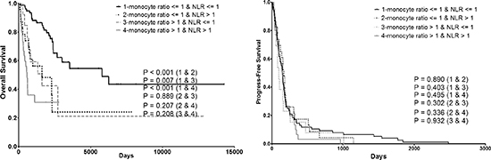 Figure 4: Combining prognostic value of monocyte ratio and NLR ratio on both OS and PFS. PFS progress-free survival, OS overall survival.