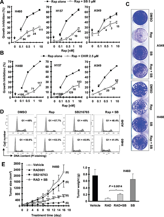 Figure 1: The presence of the GSK3 inhibitor, SB216763 or CHIR99021, antagonizes rapamycin’s growth inhibitory effects evaluated in a 3-day monolayer culture assay (A and B), in an 8-day colony formation assay (C), by cell cycle analysis (D) and in a nude mice xenograph model (E). (A and B), The given lung cancer cell lines were plated on 96-well cell culture plates and treated next day with the indicated concentrations of rapamycin (Rap) alone, SB216763 (SB) or CHIR99021 (CHIR) alone (as indicated by arrow inside the graphs) or their combination. After 3 days, cell numbers were estimated using the SRB assay and CIs were calculated with CompuSyn software and labeled inside the graphs. Data, means of four replicated determinations; Bars, ± SDs. (C), The indicated cell lines at a density of approximately 400 cells/well were seeded in 12-well plates. On the second day, the cells were treated with DMSO, 10 nM rapamycin, 5 μM SB216763, or rapamycin plus SB216763 (SB). After 8 days, the plates were stained for the formation of cell colonies with crystal violet dye and pictured using a digital camera. (D), The indicated lung cancer cell lines were treated with DMSO, 10 nM rapamycin, 5 μM SB216763, or rapamycin plus SB216763 for 48 h and then harvested for cell cycle analysis by flow cytometry. (E), H460 xenografts were treated with indicated agents. This study was done in conjunction with our previous INK128 and SB216763 combination experiment and thus the vehicle and SB216763 groups were shared to minimally use mice (see details in “Materials and Methods”). Tumor sizes were measured once every two days. Each measurement is a mean ± SE (n = 6). At the end of the experiment, tumor xenografts were removed and weighed. **P < 0.01; ***P < 0.001 compared with RAD001 group alone using the student t test.