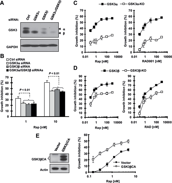 To further validate our finding, we examined the impact of specific genetic inhibition of GSK3, including gene knockdown and knockout, on cell responses to a rapalog. Small interfering RNA (siRNA)-mediated knockdown of GSK3α, GSK3β or both were confirmed with Western blotting (Fig. 2A). In a 3-day growth-inhibition assay, knockdown of GSK3α, GSK3β or both significantly reduced cell sensitivity to rapamycin (Fig. 2B). Consistently, GSK3α-KO or GSK3β-KO murine embryonic fibroblasts (MEFs) were drastically less sensitive to both rapamycin and RAD001 in comparison with wild-type (WT) MEFs (Figs. 2C and 2D). Taken together, these data further support the notion that inhibition of GSK3 impairs cell response to rapalogs.