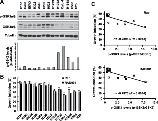 Figure 3: Basal levels of p-GSK3 in human lung cancer cell lines (A) are inversely correlated with cell sensitivity to rapalogs (B and C). Whole-cell lysates were prepared from the listed cell lines with comparable cell densities and subjected to Western blotting for detection of the indicated proteins (A). The intensities of these proteins were quantified with NIH Image J software. The growth-inhibitory effects of rapamycin or RAD001 at 10 nM were determined with the SRB assay after 3 days. The correlation between p-GSK3/GSK3 and growth inhibition was calculated with GraphPad InStat software (B and C).