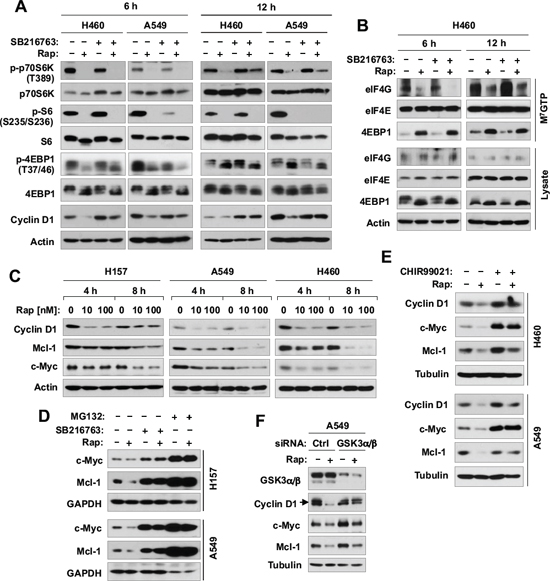 Figure 4: Inhibition of GSK3 with SB216763 or siRNA rescues rapamycin-induced reduction of cyclin D1, c-Myc and Mcl-1 (A, C-F) without blocking rapamycin-mediated suppressive effects on mTORC1 signaling (A) and on cap binding (B). (A and B), The indicated cell lines were treated with DMSO, 10 nM rapamycin (Rap), 5 μM SB216763, or rapamycin plus SB216763 for 6 h or 12 h. (C), The indicated cell lines were exposed to different concentrations of rapamycin for 4 or 8 h. (D), The indicated cell lines were treated with DMSO, 10 nM rapamycin, 5 μM SB216763, 10 μM MG132, rapamycin plus SB216763, or rapamycin plus MG132 for 6 h. (E), The indicated cell lines were treated with DMSO, 10 nM rapamycin, 10 μM CHIR99021, or rapamycin plus CHIR99021 for 6 h. (F), A549 cells were transfected with the given siRNAs and after 48 h were exposed to 10 nM rapamycin for 6 h. After the aforementioned treatments, the cells were then harvested for preparation of whole-cell protein lysates and subsequent Western blotting. Moreover, lysates from H460 cells (B) were also used to the m7GTP pull-down and subsequent detection of the given proteins by Western blot analysis (B).