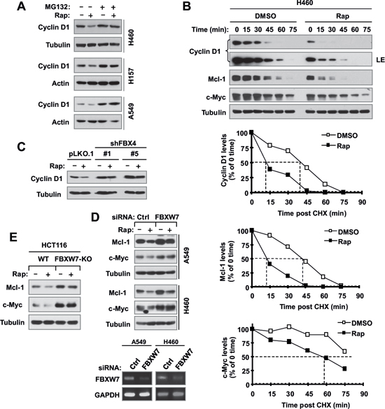Figure 5: Rapamycin decreases the levels of cyclin D1, c-Myc and Mcl-1 through facilitating their degradation (A and B), which is mediated by either FBX4 (C) or FBXW7 (D and E). (A), The indicated cell lines were pre-treated with 10 μM MG132 for 30 min and then co-treated with 10 nM rapamycin for 6 h. (B), H460 cells were treated with DMSO or 10 nM of rapamycin for 6 h. The cells were then washed with PBS 3 times and re-fed with fresh medium containing 10 μg/ml CHX. At the indicated times, the cells were harvested for preparation of whole-cell protein lysates and subsequent Western blot analysis. Protein levels were quantified with NIH Image J Software and were normalized to tubulin. (C) The indicated A549 transfectants were exposed to 10 nM rapamycin for 6 h. (D) The indicated cells were transfected with the given siRNAs and after 48 h were exposed to 10 nM rapamycin for an additional 6 h. (E) The indicated cell lines were exposed to 10 nM rapamycin for 6 h. After the aforementioned treatments (A, C–E), the cells were then harvested for preparation of whole-cell protein lysates and subsequent Western blotting to detect the given proteins. Cellular total RNA was also extracted from the indicated cell lines in E for RT-PCR detection of FBXW7.