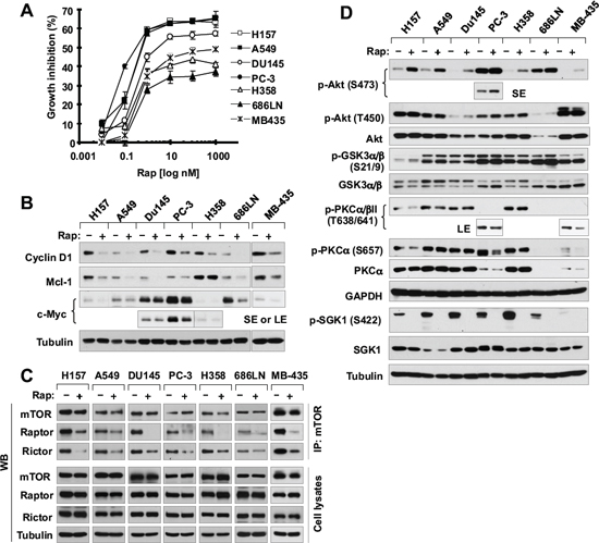 Figure 6: Rapamycin inhibits the growth of various cancer cell lines (A) accompanied with decreasing the levels of cyclin D1, c-Myc and Mcl-1 (B), disrupting the assembly of both mTORC1 and mTORC2 (C) and differential effects on the phosohorylation of several AGC kinase proteins (D). (A) The indicated cell lines were exposed to various concentrations of rapamycin (Rap) for 3 days. Cell numbers were estimated with the SRB assay. Data, means of four replicated determinations; Bars, ± SDs. (B and D) The indicated cell lines were treated with 10 nM rapamycin for 4 h and then cells were harvested for preparation of whole-cell protein lysates and subsequent Western blotting. (C) The indicated cell lines were treated with 10 nM rapamycin for 1 h and then harvested for preparation of whole-cell protein lysates followed with immunoprecipitation (IP) using an mTOR antibody and subsequent Western blotting (WB) to detect the indicated proteins. LE, longer exposure; SE, shorter exposure.