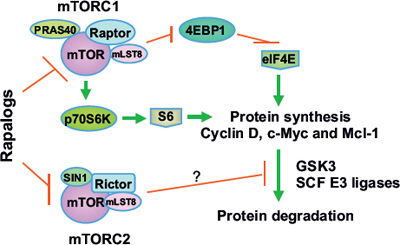 The mammalian target of rapamycin (mTOR) is a serine-threonine protein kinase belonging to the family of the phosphatidylinositol 3-kinase-related kinases [1]. It critically regulates various biological functions, particularly cell growth, metabolism and survival, largely through forming two distinct complexes with different partner proteins: raptor (mTOR complex 1; mTORC1) and rictor (mTOR complex 2; mTORC2) [2–4]. The mTORC1 signaling primarily regulates cap-dependent protein translation initiation, an essential process for synthesis of many oncogenic proteins such as cyclin D1, c-Myc, Mcl-1, HIF1α and VEGF [3, 4]. This signaling pathway is often dysregulated (activated) in various types of human cancers, largely due to hyper-activation of PI3K/Akt and Ras/Raf/MEK/ERK signaling, and hence has emerged as an attractive cancer therapeutic target [5–7]. The conventional mTOR inhibitors, rapamycin and its analogues (rapalogs), are specific allosteric inhibitors of mTOR. It is generally thought that these rapalogs have weak activity against the mTORC2 while strongly inhibiting mTORC1 activity. In the clinic, the single-agent activity of rapalogs in most tumor types has been modest at best although some of them (e.g., everolimus) have been approved by the FDA for treatment of several types of cancers such as advanced renal cell cancer and pancreatic neuroendocrine tumors [8]. Currently, it is unclear why most types of cancers respond poorly to rapalog monotherapy.