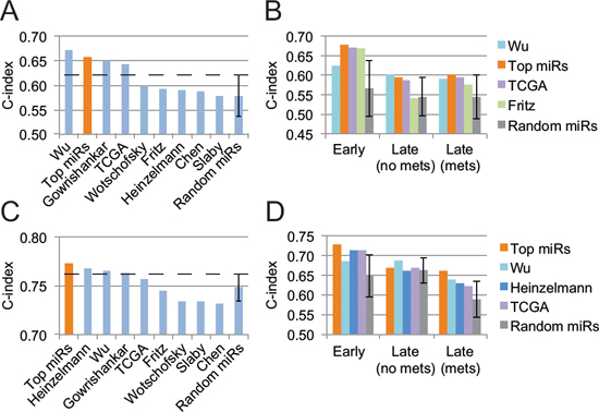 When compared to other published miRNA signatures on the validation cohort, our “top miRs” signature outperforms all other, to the exception of Wu et al.’s, in terms of overall survival prediction (Fig. 2A). Of note, it surpassed all other signatures in the training cohort (Supplementary Fig. S1A). However, with respect to tumor stage and metastasis, one observes that our “top miRs” signature is superior to all other signature for early-stage patients and for late-stage patients with metastases, and only slightly inferior to Wu et al.’s for late-stage patients without metastases (Fig. 2B). Interestingly, only four signatures, including ours, lie further away than one standard deviation from a random 5-miRNA signature.
