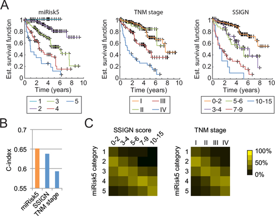 A continuous risk, as resulting from a Cox regression analysis, has a high discriminative power but is unpractical for clinical usage. Consequently, we summarized our composite risk into 5 categories to provide a usable tool, referred to as miRisk5 (see Supplementary Methods). Kaplan-Meier survival curves, as displayed in Fig. 3A, show that our summarized risk is able to span a wider range of patient outcomes than the TNM staging or the Mayo Clinic score (SSIGN), which is another well-established scoring system for RCC patients [28]. Both the TNM staging and the SSIGN score identify three different groups while miRisk5 clearly separates 5 different groups. Additionally, miRisk5 provides a substantial amelioration with respect to TNM staging (c-index of 0.65 vs. 0.59 for the TNM staging; Fig. 3B). Although it does not significantly outperform the SSIGN score in terms of prognosis, it does assign patients into different risk groups than the SSIGN or the TNM score (Fig. 3C).