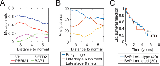 To further investigate a potantial association of BAP1 mutation and tumor stage, we measured tumor progression as the distance to the average miRNA values of normal patients (group “N”) and analyzed the mutation rates of the four most mutated genes in ccRCC with respect to the aforementioned distance. We observed that the BAP1 mutation rate increases with the distance, as one would expect, although not in a linear fashion (Fig. 6A). Indeed, the gain in BAP1 mutations seems to be restricted to patients within a distance of 3.5 to 4.5 to the normal group. VHL and PBRM1 mutations decrease linearly as the distance augments and SETD2 mutations peak at a distance of 3.5. VHL and PBRM1 have been reported as founding mutations [3] and high mutation rates at short distances concur with this hypothesis. As the tumor progresses, the environmental pressure changes and core mutations may not be required anymore, which in turn would translate into a decrease in mutation rates.