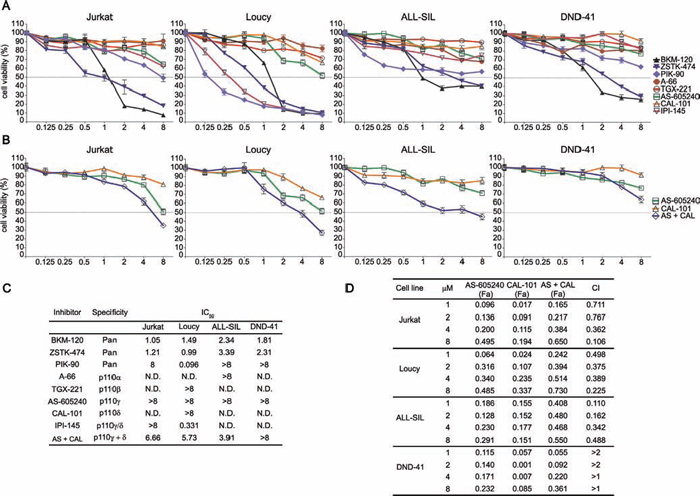 Figure 1: Inhibition of all the PI3K catalytic isoforms exerts the strongest effects on T-ALL cell line viability. A and B. MTT analysis of PTEN deleted (Jurkat, Loucy) and non deleted (ALL-SIL, DND-41) T-ALL cell lines treated for 48 h with increasing concentration of PI3K inhibitors (BKM-120, ZSTK-474, and PIK-90 are pan-inhibitors; A-66, TGX-221, AS-605240, CAL-101 are selective inhibitors of p110α, p110β, p110γ, and p110δ, respectively; IPI-145 is a dual inhibitor of p110γ/δ). (B) Effects of the combination consisting of AS-605240 and CAL-101 on cell viability. C. IC50 values obtained through MTT assays after 48 h treatment with increasing concentrations of PI3K inhibitors. Three replicates per tested concentration and at least two independent experiments were performed (bars, SD). D. Analysis of the effects of the AS-605240 (p110γ inhibitor) and CAL-101 (p110δ inhibitor) combination, which resulted synergistic in Jurkat, Loucy, and ALL-SIL cells (CIs 0.1–0.9). In DND-41 cells, CIs values > 2 indicate an antagonistic effect, whereas CIs > 1 are additive. (CI: combination index; Fa: Fraction affected).