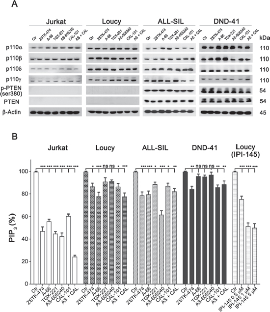 Firstly, we investigated cell lines with regard to PI3K isoforms and PTEN expression. As shown in Fig. 3A, the catalytic subunits p110α, −β, −γ and −δ were expressed in control as well as treated samples to a similar extent. As expected, PTEN protein was absent in Jurkat and Loucy cells, but abundantly expressed and unaffected by drug treatments in ALL-SIL and DND-41 cells. Nevertheless, in both of these cell lines, PTEN was phosphorylated at Ser380, which is a marker of PTEN posttranslational inactivation by CK2 and consequent PI3K pathway activation [12, 33].