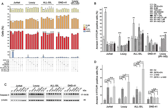Since PI3K/Akt signaling controls different cellular pathways, we examined the inhibitor effects on cell cycle and induction of apoptosis. Interestingly, cell cycle was affected in all the cell lines following pan-inhibition (ZSTK-474 treatment for 48 h) (Fig. 5A). Flow cytometric analysis documented an accumulation of cells in the G0/G1 phase of the cell cycle and a consequent decrease of cells in the S or G2/M phases, as previously reported [23], which reached a statistical significance in ALL-SIL and DND-41 cells. Moreover, in Jurkat, Loucy, and ALL-SIL cells, ZSTK-474 increased the subG1 cell fraction, which comprises death cells. Less dramatic effects were observed with the other inhibitors, which affected only ALL-SIL and Loucy cells. In particular, the combination of AS-605240 and CAL-101 altered cell cycle phase distribution in Loucy cells, by increasing the G0/G1 fraction. However, the dual γ/δ inhibitor IPI-145 had no effects.