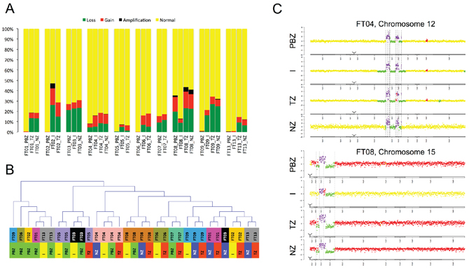 For each biopsy, we classified CNAs as ‘normal’, ‘loss’, ‘gain’ or ‘amplification’ (Figure 1A). Samples with less than 1% of altered profile were considered potential normal brain zones or slightly infiltrated areas. For the other samples, we observed a strong heterogeneity in terms of percentage of altered profiles. This heterogeneity was mostly inter-individual as samples from the same patient showed a relatively stable percentage of altered profiles. FT02 and FT08 tumors were the most altered, with more than 30% of altered profiles and a high proportion of amplifications, whereas all FT05 samples presented only a small fraction of alterations (less than 10%). Samples classification based on CNAs profiles confirmed the distinction between altered and non-altered samples. Samples harboring more than 1% of altered profiles were grouped in one cluster separated from potential normal brain zones or slightly infiltrated areas (Figure 1B). This cluster highlighted very similar alteration profiles within samples originating from the same patient, particularly for FT04 and FT08. These similarities were associated with some patient specific and atypical alterations, on chromosome 12 for FT04 and on chromosome 15 for FT08 (Figure 1C).