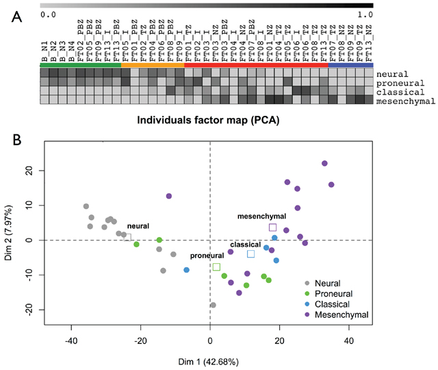 Figure 3: GB subtypes. A. Samples GB subtypes according to the Verhaak signature. Gene Set Enrichment Analysis enrichment scores of each samples are reported as a gray-based color gradient. B. Samples GB subtypes and zone-specific profiles determined by PCA. Samples are colored according to their GB subtype. Squares: barycenter of GB subtypes.