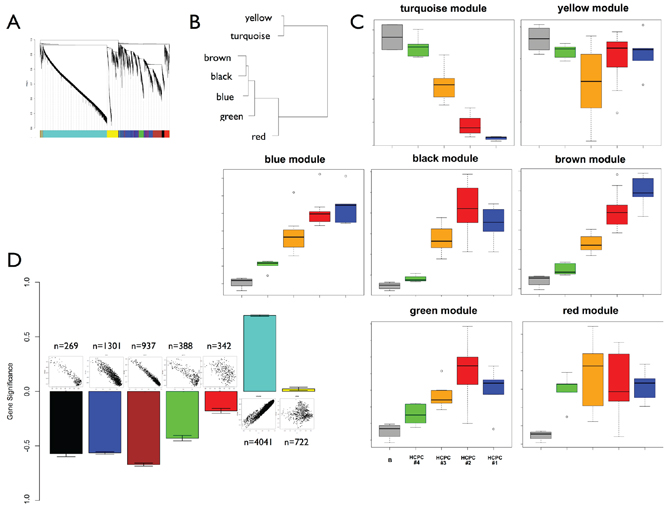 Figure 4: Weighted gene co-expression network analysis. A. Cluster dendrogram and co-expression modules. B. Clustering of module eigengenes. C. Module eigengenes expression across the sampling plan. Boxplots are colored according to HCPC classification. The gray boxplot represents reference control brain samples (n = 4). The green boxplot includes HCPC1 samples minus reference control brain samples. D. Gene significance (mean and standard error) for each module. Above each bar is a scatter plot of gene significance (GS) versus module membership (MM). GS is based on p-values from the ANOVA performed between HCPC clusters (BH corrected p-values). Number of probes in each module is also reported.