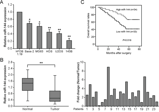 Figure 1: Downregulation of miR-144 in OS cell lines and tissues is associated with poor prognosis. A. qRT-PCR was conducted to quantify endogenous expression of miR-144 in the human osteoblastic cell line, hFOB 1.19, and four OS cell lines, using U6 as the normalization control. B. miR-144 expression is frequently decreased in OS tissues. The left-hand panel shows expression of miR-144 in 24 paired OS and adjacent normal bone tissues. The right-hand panel shows miR-144 expression relative to adjacent normal tissues. Each bar represents the mean of 3 independent experiments. C. Kaplan-Meier analysis for overall survival in 67 OS patients in high- and low-risk groups based on miR-144 expression levels. *P < 0.05, **P < 0.01.