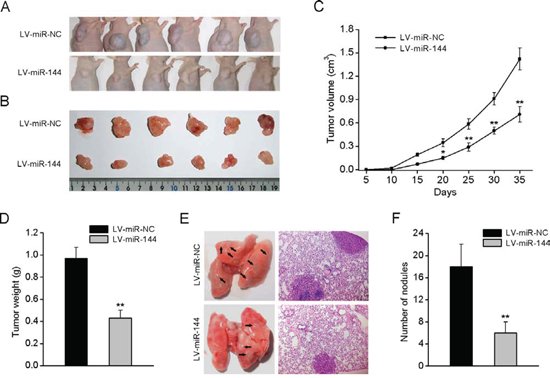 Figure 4: miR-144 suppresses tumorigenesis and metastasis in nude mice. A. 143B cells stably overexpressing miR-144 or NC were inoculated subcutaneously into nude mice (n = 6). At 35 days post inoculation, mice were sacrificed. Representative tumors are shown in B. C. Growth curve of tumor volumes. D. Tumor weight. E. Representative photos and H&E-stained sections of lung tissues isolated from mice administered a tail vein injection of 143B cells stably overexpressing miR-144 or NC (n = 6). Quantification of lung metastatic nodules of each group is shown in F. *P < 0.05, **P < 0.01.