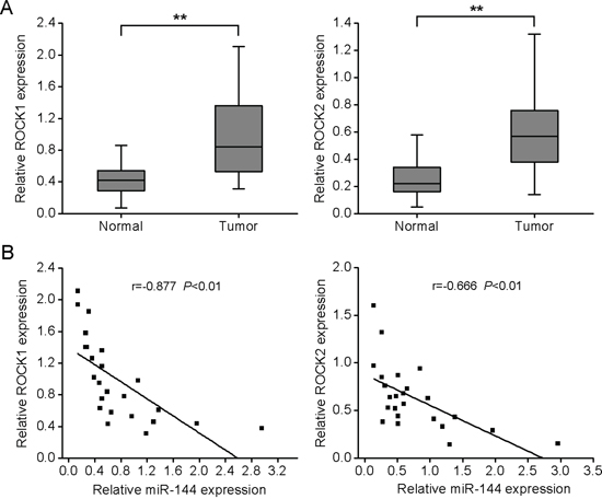 ROCK1 and ROCK2 are upregulated in OS and inversely correlated with miR-144 expression