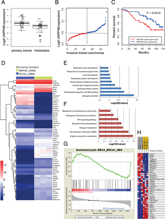 Figure 1: Gene expression and enrichment analysis influenced by INPP4B knockdown in MCF-10A cells. A. Box-plots indicating significantly overall lower INPP4B expression in metastatic compared to primary melanomas (overall INPP4B loss: 48.6%). B. Ranked INPP4B expression in ductal invasive breast carcinomas (n = 93) and C. Kaplan-Meier survival curves comparing disease-free survival between cases with the lowest (< 50th percentile) vs. highest (> 50th percentile) INPP4B expression (P = 0.0316, log-rank test). D. Heatmap of the differentially expressed genes of MCF-10A shRNA-Renilla luciferase and shRNA-INPP4B cell pools (adjusted p value < 0.05). High and low levels of gene expression relative to median expression are represented by red and blue boxes, respectively. E. Biological processes and F. Kyoto Encyclopedia of Genes and Genomes (KEGG) pathways enriched in genes associated with INPP4B knockdown. G. Gene set enrichment analysis (GSEA) plot. H. Heatmap highlighting coordinated differential expression of the ‘BRCA_BRCA1_NEG gene signature’ in INPP4B knockdown cells (P < p = 0.0001). Gene expressions negatively correlated with BRCA1 germline status in breast cancer are listed.