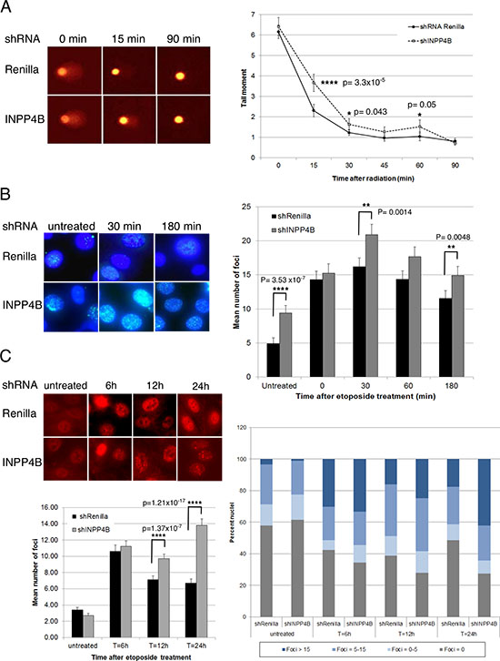 Figure 2: INPP4B loss in human ovarian cancer cells results in a DNA repair defect. A. Stable Ovca429 knockdown cell pools were irradiated (30 Gy) and comet assays conducted. Tail moments were measured 0 min, 15 min, 30 min, 45 min, 60 min and 90 min post-treatment. Representative pictures are shown. B. Ovca429 knockdown cell pools were fixed 0 min, 30 min, 60 min and 180 min after etoposide treatment and γH2AX foci quantified. Representative pictures are shown. C. Ovca429 knockdown cell pools were fixed 6 h, 12 h or 24 h after etoposide treatment and RAD51 foci quantified. INPP4B knockdown cell pools displayed higher percentage of nuclei containing > 15 foci per nucleus compared to the control cells. Representative pictures are shown.