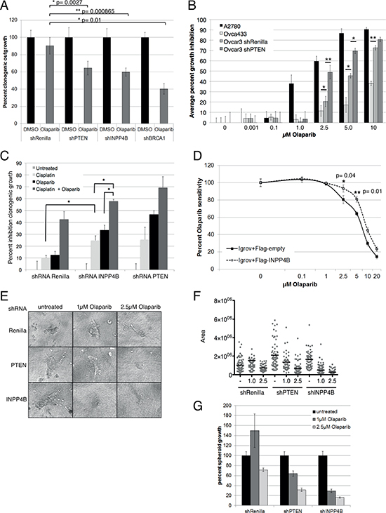 Figure 3: INPP4B loss sensitizes to PARP inhibitor treatment in vitro. A. Ovca429 Renilla luciferase, PTEN, INPP4B and BRCA1 knockdown pools were treated continuously with 1 μM Olaparib. Percentage clonogenic growth is displayed. B. Olaparib dose-response growth curve of human ovarian cell lines Ovca433 (INPP4B+/+, PTEN+/+), Ovcar-3 shRNA-Renilla luciferase (INPP4B−/−, PTEN+/+), Ovcar-3 shRNA-PTEN (INPP4B−/−, PTEN−/−) and A2780 (INPP4B−/−, PTEN−/−). (*p ≤ 0.05, **p ≤ = 0.01 ). C. Clonogenic assays of Ovca429 knockdown cell pools using cisplatin alone or in combination with continuous olaparib treatment. Percent inhibition clonogenic growth displayed. D. Olaparib dose response curve of Igrov-1 cells (INPP4B−/−, PTEN+/+) expressing Flag-INPP4B or empty vector control. Percent growth is displayed. E. In three-dimensional growth assays Ovca429 Renilla luciferase, PTEN or INPP4B knockdown cells were seeded and established spheroids treated with olaparib. Representative pictures are shown. F. Quantification of three-dimensional assay using a linear plot, G. or bar graphs.