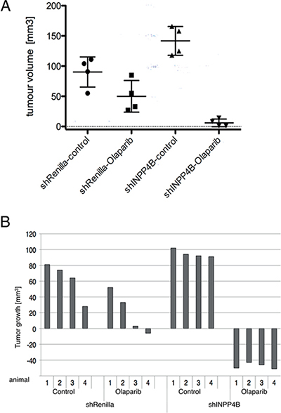 Ovca429 INPP4B or control knockdown cell pools were subcutaneously injected into nude mice. Animals with established tumors were injected daily with olaparib (50 mg/kg) or DMSO. Two weeks post-treatment, mice were sacrificed and tumor volume measured and quantified. As anticipated animals injected with Ovca429 shRNA-INPP4B cells presented larger tumors compared to animals bearing Ovca429 shRNA-Renilla luciferase tumors. Upon olaparib treatment volumes of shRNA-INPP4B expressing tumors showed significant reduction compared to control treatment or shRNA-Renilla luciferase expressing tumors (Figure 4A). Waterfall plot analysis comparing tumor volumes at start and treatment end point revealed great reduction of tumor volumes in the olaparib-treated INPP4B-deficient cohort in contrast to the control cohort, which exhibited little to moderate response to treatment (Figure 4B).