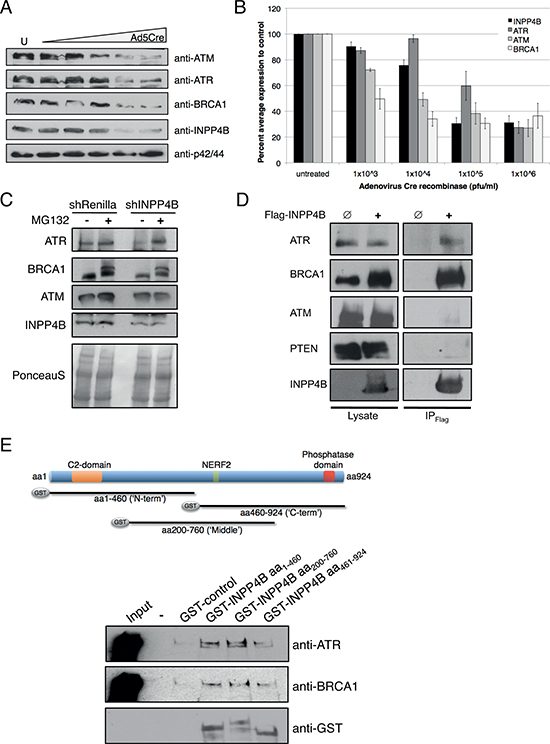 Figure 5: INPP4B loss results in concomitant loss of BRCA1, ATR and ATM protein levels. A. INPP4Bfl/fl MEFs were infected with increasing amounts of Ad5Cre and blots probed for INPP4B, ATM, ATR, BRCA1 and p42/44 total protein levels. B. Quantitation of percent average protein expression to control treated INPP4Bfl/fl MEFs. C. MG132 proteasome inhibitor treatment of Ovca433 shRNA-Renilla luciferase and shRNA-INPP4B cell pools. Western blots were probed for INPP4B, ATM, ATR and BRCA1. D. Flag-INPP4B interacts with ATR and BRCA1 but not with ATM and PTEN in 293T immunoprecipitation experiments. E. GST-pull down experiments using bacterially expressed INPP4B N-terminal (aa1–460), middle (aa200-aa760) and C-terminal (aa460-aa924) fragments and ATR or BRCA1 overexpressed in unchallenged 293T cells.