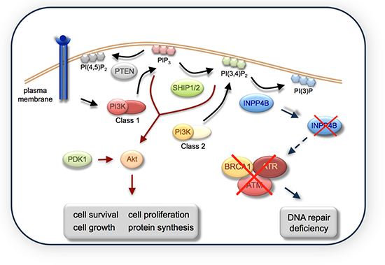 Extensive studies have revealed the impact of the PI3K/Akt pathway activation on three cellular processes crucial for tumor progression: cell proliferation, cell survival and cell growth. Class IA PI3K activation gives rise to phosphatidylinositol(3, 4, 5)trisphosphate (PIP3) and phosphatidylinositol(3, 4)bisphosphate (PI(3, 4)P2) [5]. PIP3 and PI(3, 4)P2 bind to the pleckstrin homology domain of serine/threonine kinases Akt and PDK1, which results in increased cell proliferation, survival and cell growth [6]. Mechanisms to dephosphorylate PIP3 include the activity of lipid phosphatases PTEN and SHIP1/2, which hydrolyze PIP3 to PI(4, 5)P2 and PI(3, 4)P2, respectively [7, 8]. PI(3, 4)P2 is the main phospholipid substrate of the tumor suppressor inositol polyphosphate 4-phosphatase type II (INPP4B) which acts downstream of SHIP1/2 and produces PI(3)P, thereby terminating signaling through the PI3K/Akt pathway. Loss of INPP4B expression has been found in various human cancers with major loss in breast, ovarian and prostate cancers, as well as in melanomas [9, 10] and results in increased cell proliferation, migration and invasion. Furthermore, loss of INPP4B was shown to lead to increased signaling through the PI3K/Akt pathway [9, 11].