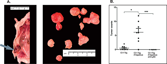 Figure 1: Tumor multiplicity assessment in experimental groups of 15-week-old C3-1-TAg mice. (A) Grossly visible tumors (arrow) found in each mouse were removed, placed on a petri dish and counted. (B) The statistical analysis of mammary tumor count data shows that infection with H. hepaticus accelerates tumorigenesis, whereas the depletion of neutrophils negates this effect. The y-axis depicts the mean ± SEM of mammary tumor counts. *p < 0.05. The points correspond to the mean of total tumors counted in each mouse.