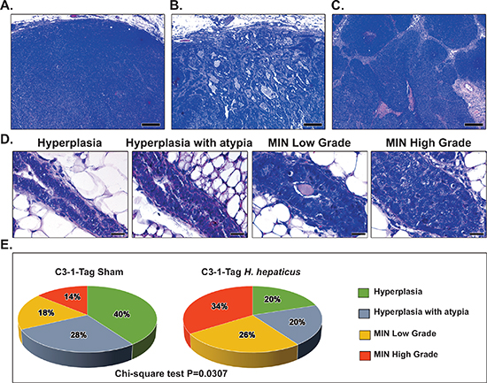 The unencapsulated expansile tumors in both H. hepaticus- and sham-treated mice had the typical C3-1-TAg mouse mammary adenocarcinoma histomorphology (Figures 2A–2C). In the non-tumoral mammary tissue, ducts and terminal duct lobular units (TDLU) showed a spectrum of hyperplastic, preneoplastic, and early neoplastic lesions depicting the well-characterized stages of the C3-1-TAg mouse mammary tumorigenesis progression (Figure 2D). In the non-tumoral areas the affected mammary epithelia of H. hepaticus-treated mice appeared to be in more advanced tumorigenesis stages by comparison with the uninfected controls. In order to confirm this observation we determined histomorphometrically the percentage of abnormal glands at each one of four critical histological stages of mammary tumorigenesis in H. hepaticus-infected and non-infected mice. We found that the classification of abnormal glands according to their histological stage differed significantly between experimental groups (P = 0.0307), with H. hepaticus-infected mice having a higher percentage of abnormal glands with mammary intraepithelial neoplasia (MIN) when compared to controls (Figure 2E).