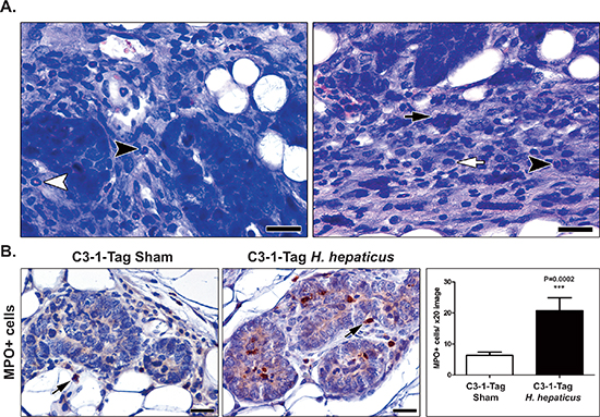 Figure 3: H. hepaticus infection up-regulates MIN-associated neutrophils. (A) The tumor-associated inflammation was comparable in large-sized neoplasms of both H. hepaticus-infected and uninfected control mice. Neutrophils (black arrow-heads), myeloid precursor cells (white arrow-head), mast cells (black arrow) and macrophages (white arrow) at the periphery of tumors are shown. (B) Morphometric counts of MPO-positive cells (arrows) in MIN lesions. The numbers of neutrophils are significantly higher in H-hepaticus infected mice compared to controls. Hematoxylin and Eosin (A) IHC; Diaminobenzidine chromogen, Hematoxylin counterstain (B) Scale bars: 25 μm (A) and 50 μm (B) Numbers on the y-axis of bar graph correspond to the mean ± SEM of MPO+cells. ***p < 0.0001.