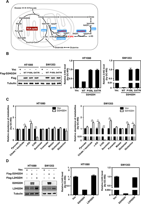 Figure 1: Ectopic expression of D2HGDH reduces D-2-HG in IDH-mutated cancer cells. (A) A scheme of metabolic pathways involved in D-2-HG metabolism. (B) D2HGDH overexpression reduces D-2-HG production in IDH mutant cells. Flag-tagged wild-type or mutant D2HGDH was stably overexpressed in HT1080 and SW1353 cells as indicated. The ectopically expressed proteins were determined by western blot analysis (left panel). Tubulin was used as a loading control. The intracellular concentration of 2-HG was determined by GC-MS analysis as described in “Method” (middle and right panels). (C) D2HGDH overexpression increases α-KG levels in IDH mutant cells. Intracellular concentrations of α-KG and other metabolites were determined by GC-MS analysis. (D) The effect of 2HGDH on reducing 2-HG is chiral-specific. Flag-tagged D2HGDH or L2HGDH was stably overexpressed in HT1080 and SW1353 cells. The ectopically expressed protein levels were determined by western blot analysis. The L2HGDH antibody likely recognizes the endogenous protein. Shown are average values with standard error (SEM) of triplicated experiments. *denotes p < 0.05, **denotes p < 0.01, and ***denotes p < 0.001 for the indicated comparison.
