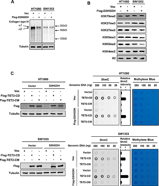 Figure 2: Ectopic expression of D2HGDH restores the activity of several α-KG-dependent dioxygenases. (A) D2HGDH overexpression promotes the maturation of Collagen Type IV. Flag-tagged D2HGDH was stably overexpressed in HT1080 and SW1353 cells. In these stable cells, soluble collagen Type IV, which indicates the immature collagen, was detected by western blotting under reducing conditions with a collagen Type IV antibody. (B) D2HGDH overexpression decreases the levels of H3K9me2 and H3K9me3 in SW1353 cells, but not in HT1080 cells. Flag-tagged D2HGDH was stably overexpressed in HT1080 and SW1353 cells. Levels of various histone lysine methylations were detected by western blotting with specific antibodies. Total H3 was used as a loading control. (C) D2HGDH increases genomic 5 hmC levels in TET2 expressing cells. Flag-tagged D2HGDH was stably overexpressed in HT1080 and SW1353 cells, and these stable cells were transiently transfected with plasmids of wild-type TET2CD or its catalytic inactive mutant TET2CM as indicated. Forty-eight hours after transient transfection, genomic DNA was isolated, and 5 hmC was determined by dot-blot analyses. Methylene blue staining was performed to control equal DNA loading. The levels of transiently expressed Flag-tagged proteins were determined by western blot analysis (left panels).
