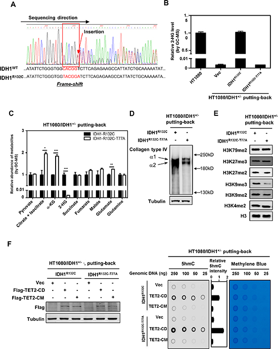 Figure 3: Putting-back IDH1-R132C in HT1080/IDH1+/− cells restores D-2-HG and inhibits the activity of several α-KG-dependent dioxygenases. (A–B) Deletion of the mutant IDH1-R132C allele in HT1080 cells eliminates D-2-HG production. The TALEN technology was applied to generate HT1080 cells with knock-out of endogenous IDH1-R132C (HT1080/IDH1+/−). Genomic sequencing confirmed the frame-shift mutation in IDH1-R132C allele, while the wild type IDH1 allele was intact (A). In accord, D-2-HG production was abolished in HT1080/IDH1+/− cells as determined by GC-MS analysis (B). (C) Putting-back IDH1-R132C in HT1080/IDH1+/− cells decreases the levels of α-KG and its neighboring metabolites. The intracellular concentrations of α-KG and other metabolites as indicated were determined by GC-MS analysis as described in “Method”. (D) Putting-back IDH1-R132C in HT1080/IDH1+/− cells restores D-2-HG and inhibits the maturation of Collagen Type IV. Soluble immature collagen IV protein was detected by western blotting. (E) Putting-back IDH1-R132C in HT1080/IDH1+/− cells increases the levels of H3K9me2 and H3K9me3. Histone lysine methylation was determined by western blotting with specific antibodies as indicated. Total H3 was used as a loading control. (F) Putting-back IDH1-R132C in HT1080/IDH1+/− cells decreases genomic 5 hmC. In HT1080/IDH1+/− cells re-expressing cells, wild-type TET2CD or its catalytic inactive mutant TET2CM was transiently expressed. Forty-eight hours after transfection, genomic DNA was isolated, and 5 hmC was determined by dot-blot analyses. Methylene blue staining was performed to control equal DNA loading. The levels of transiently expressed Flag-tagged proteins were determined by western blot analysis (left panel). For (B) and (C), shown are average values with standard error (SEM) of triplicated experiments. *denotes p < 0.05, **denotes p < 0.01, and ***denotes p < 0.001 for the indicated comparison.