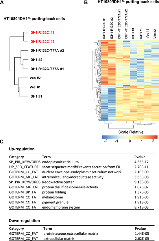 Figure 4: D-2-HG accumulation is associated with selective regulation of gene expression in HT1080 cells. HT1080/IDH1+/− cells putting-back empty vector (Vec), wild-type IDH1 (IDH1), D-2-HG producing related mutant IDH1 (IDH1-R132C) and enzymatic inactive double mutant IDH1 (IDH1-R132C-T77A) were used for gene expression profiling. Hierarchically clustering of cell lines based on gene expression are shown in (A). The differentially expressed genes among the indicated clustered groups are presented in (B). The functional annotation enrichment of up- and down-regulated pathways is listed in (C).