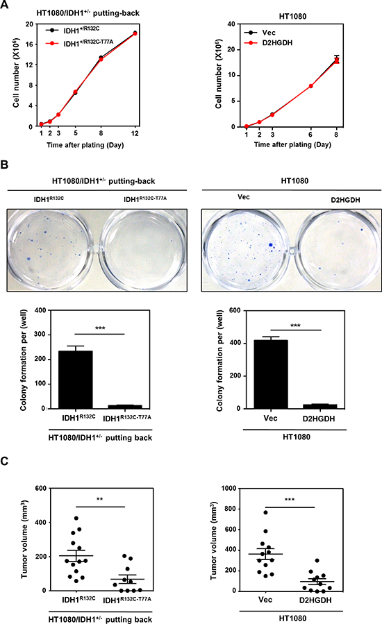 Figure 5: D-2-HG production is required for anchorage independent growth in vitro and tumor growth in vivo. (A) D-2-HG does not affect cell proliferation. Growth curves of HT1080/IDH1+/− cells with IDH1 putting-back (left panel) or HT1080 with D2GHDH overexpression (right panel) were determined. (B) D-2-HG promotes anchorage independent growth of HT1080 cells. HT1080/IDH1+/− putting-back cells or HT1080 cell pools stably overexpressing Flag-D2HGDH were seeded in 6-well plates, and soft-agar colony formation assay was performed. Representative plates are shown. Quantification of colony numbers was derived from three independent experiments. (C) D-2-HG is required for tumor growth of HT1080 cells. HT1080/IDH1+/− putting-back cells or HT1080 cell pools stably overexpressing Flag-D2HGDH (2*106 cell) were injected subcutaneously into the flanks of nude mice. The tumor volume was carefully monitored during a period of 20–25 days after injection. In the end, tumors were extracted, photographed and weighted. Shown are average values with standard error (SEM) of triplicated experiments. **denotes p < 0.01 and ***denotes p < 0.001 for the indicated comparison.