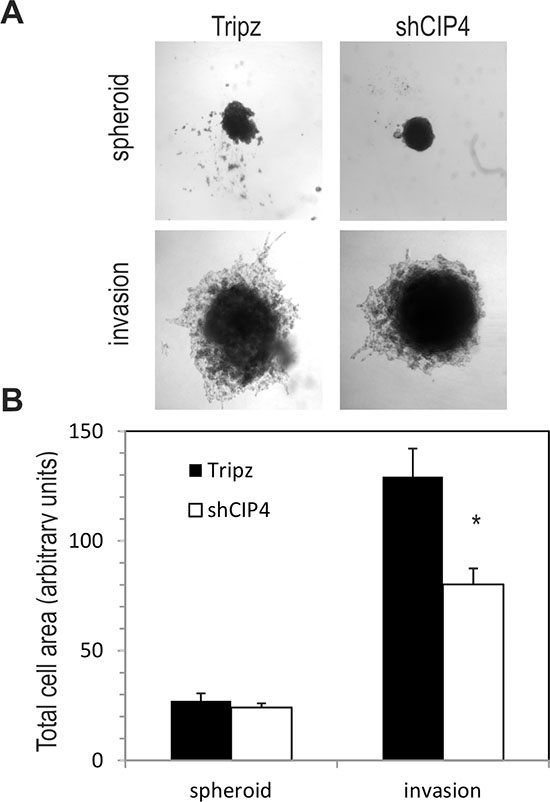 Figure 3: CIP4 promotes TNBC cell invasion. (A) Representative phase contrast images of spheroid colonies for MDA-MB-231 Tripz or shCIP4 (day 3) and following addition of invasion matrix (day 10, invasion). (B) Graph represents total cell area for spheroids colonies and post-invasion colonies (mean ± SD, *p < 0.05; representative results for 1 of 3 experiments).