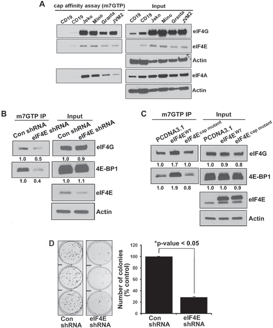 Figure 1: Integrity of eIF4F complex in normal B cells and lymphoma cells. (A) In vitro cap affinity assay was performed in 4 MCL cell lines (as indicated in the figure) and CD19+ normal B cells and western blotting was performed using eIF4G, eIF4A and eIF4E antibodies. (B) Effect of eIF4E inhibition on eIF4F complex integrity was assessed in the lysates from stably transfected HEK293eIF4E/KO and HEK293control shRNA cells by the cap affinity assay. The experiment was performed in triplicate with similar results (C) In vitro cap affinity assay in HEK293 cells after transient overexpression of eIF4EWT and eIF4Ecap mutant. The experiment was performed in triplicate. (D) Colony-forming assay was performed in stably transfected HEK293eIF4E/KO and HEK293control shRNA cells. Bars represent mean ± SD from 3 replicates. The experiment was performed in triplicate.