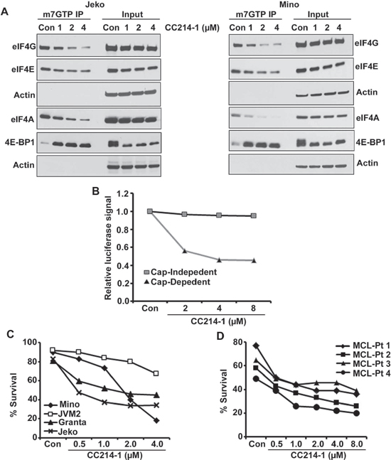 Figure 3: Effect of the dual mTOR kinase inhibitor CC214-1 on eIF4F complex. (A) Effect of CC214-1 on eIF4F complex integrity by in vitro cap affinity assay in Jeko and Mino cells. (B) Cap dependent and independent translation was assessed by luciferase reporter assay by the use of bicistronic plasmid in the presence of CC214-1. Bars represent mean ± SD from 3 replicates. (C) Survival was evaluated in Mino, JVM2, Granta and Jeko cells treated with CC214-1. (D) Effect of CC214-1 on survival inhibition in malignant cells from fresh MCL patient was evaluated using annexin V/PI staining and flow cytometry.