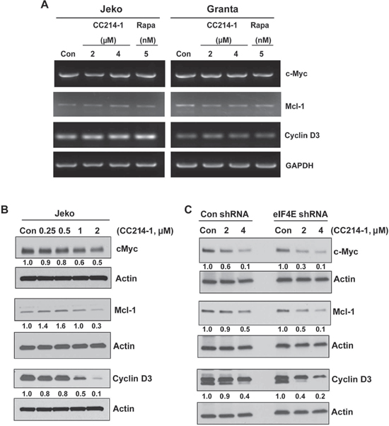 Figure 4: Effect of mTORC1/mTORC2 inhibitor CC214-1 on expression of eIF4E sensitive mRNAs. (A) RT–PCR was performed in the CC214-1 treated Jeko and Granta cells using specific primers for cyclin D3, Mcl-1 and c-Myc. GADPH is shown as a loading control. The experiment was repeated 3 times. (B) Cyclin D3, Mcl-1 and c-Myc protein expression was assessed by western blotting in Jeko cells after treatment with various concentrations of CC214-1. (C) Cyclin D3, Mcl-1 and c-Myc protein expression was assessed in eIF4E shRNA stably transfected HEK293 cells in the presence and absence of CC214-1.