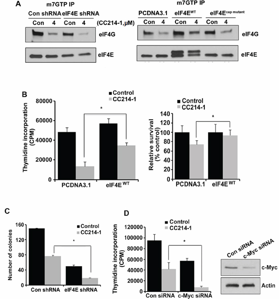 Figure 6: Effect of CC214-1 treatment on eIF4F complex and cell growth in the presence of decreased or increased eIF4E. (A, left panel) In vitro cap-affinity assay (mGTP) in HEK293 cells stably transfected by eIF4E shRNA and control shRNA plasmids. (A, right panel) In vitro cap-affinity assay was performed in the HEK293 cells transiently transfected by PCDNA3.1 eIF4Ecap mutant and eIF4EWT. The experiments were repeated 3 times. (B) HEK293 cells transiently transfected by PCDNA3.1 and eIF4EWT were treated with CC214-1 (1 μM) and thymidine incorporation assay (left panel) and flow cytometry (right panel) were performed. Bars represent mean ± SD from 3 different experiments. (C) Colony forming assay in CC214-1 (1 μM) treated HEK293 cells, stably transfected with eIF4E shRNA and control shRNA. Bars represent mean ± SD from 3 replicates. (D) HEK293 cells after transfection by control and c-Myc siRNAs, were treated with 1 μM CC214-1 and thymidine incorporation was performed. Bars represent mean ± SD from 3 replicates. The experiment was repeated 3 times. The effect of the siRNAs on c-Myc expression was analyzed by western blot.