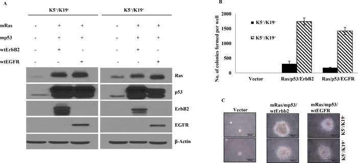 Figure 1: Transformation of K5+/K19− or K5+/K19+ cells with different gene combination. (A) K5+/K19− or K5+/K19+ cell lines over-expressing mutant p53, mutant Ras, wild type ErbB2 and wild type EGFR in triple oncogene combinations were analyzed by Western Blotting. β-Actin was used as loading control. (B) Anchorage independent growth assay of K5+/K19− and K5+/K19+ cells with vector or triple gene combinations. Mean ± S.D of a representative experiment done in triplicate is shown. Three independent experiments were done. (C) Representative images (magnification 40X) of colonies from K5+/K19− and K5+/K19+ cells with vector or triple oncogene combination are shown here.