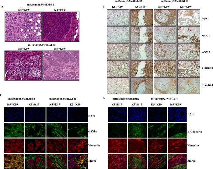 Figure 3: Transformed K5+/K19− or K5+/K19+ cells give rise to distinct tumors. (A) Representative images of H&E staining of tumor sections (magnification 20X) from K5+/K19− and K5+/K19+ cells over-expressing mRas/mp53/wtErbB2 (upper panel) or mRas/mp53/wtEGFR (Lower panel). (B) Images from different tumors at magnification 20X. Immunohistochemical staining of tumor sections with anti-CK5 (Basal/Stem), anti-MUC1 (Luminal), anti-αSMA (Myoepithelial) anti-vimentin (Stem/myoepithelial) and claudin4 (for claudin-low) antibodies. (C) Representative image of tumors from K5+/K19− orK5+/K19+ cells double immunostained with anti-αSMA (green) and anti-vimentin (red) show presence of claudin-low (SMA+/vimentin+) areas within different tumors. (D) Same tumor sections were double immunostained E-Cadherin (green) and vimentin (red) show presence of luminal like (E-Cadherin+) areas within different tumors. DAPI (blue) shows nucleus.