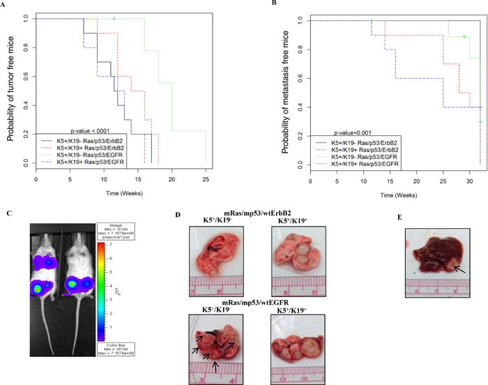Figure 5: In-vivo tumor and metastasis formation from transformed K5+/K19− or K5+/K19+ cells. (A) Kaplan-Meier plot for probability of no tumor in mice injected with K5+/K19− and K5+/K19+ cells over-expressing mRas/mp53/wtErbB2 or mRas/mp53/wtEGFR from the second experiment. (B) Kaplan-Meier plot for probability of no metastasis in above mentioned mice. (C) Representative image of mice with or without lung metastasis as shown by IVIS luciferase imaging. (D) Representative image of lung metastatic lesions formed by different cell types with either mRas/mp53/wtErbB2 (upper panel) or mRas/mp53/wtEGFR (Lower panel). (E) Representative image of liver metastasis as seen in mice injected with K5+/K19− cells over-expressing mRas/mp53/wtEGFR.