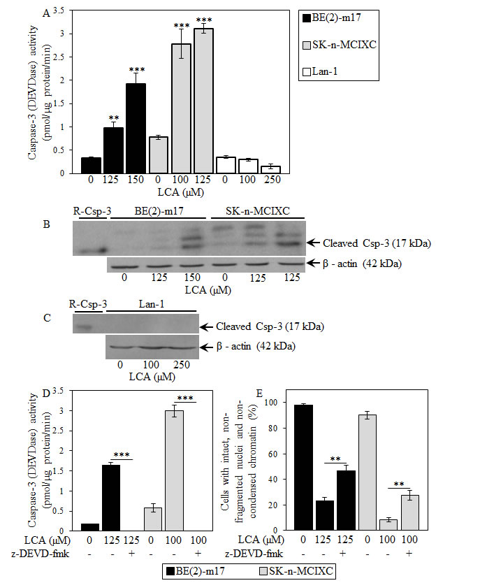 Figure 7: LCA increases activity of the initiator caspase-8 in cultured human NB cell lines BE(2)-m17 and SK-n-MCIXC (but not in Lan-1). Specific activity of caspase-8 was measured as described in Materials and Methods and expressed in picomoles of fluorescent compound 7-amino-4-trifluoromethyl coumarin released per microgram of protein per minute, based on the linear range of the curve. Data are presented as means ± SD (n = 3-4); ***p<0.001.
