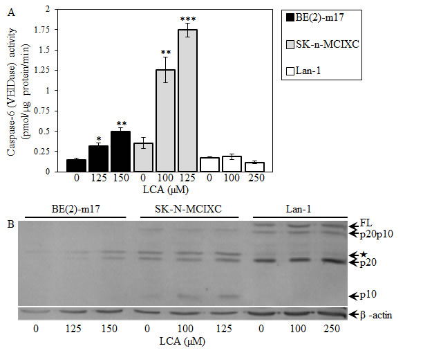 Figure 6: LCA increases activity of the executioner caspase-6 in cultured human NB cell lines BE(2)-m17 and SK-n-MCIXC (but not in Lan-1) by stimulating a proteolytic conversion of a zymogen pro-caspase-6 form into its large and small subunits known to assemble into an enzymatically active heterotetramer consisted of the two of each subunits. A. Specific activity of caspase-6 was measured as described in Materials and Methods and expressed in picomoles of fluorescent compound 7-amino-4-trifluoromethyl coumarin released per microgram of protein per minute. B. Pro-caspase-6 cleavage assay was carried out as described in Materials and Methods. The anti-human-caspase-6 mouse monoclonal IgG1 clone B93-4 antibodies raised against amino acids 271-285 (Pharmingen) were used; these antibodies specifically recognize the large (p20) and small (p10) subunits of an enzymatically active form of caspase-6. Abbreviations: FL, a full-length zymogen form of pro-caspase-6; p20p10, caspase-6 lacking the pro-domain; p20 and p10, large and small subunits (respectively) of caspase-6 lacking the pro- and linker-domains; , an unidentified protein band, perhaps p20-linker (p23), pro-p20 (p23) or pro-p20-linker subunits of caspase-6 [152]. Data in A are presented as means ± SD (n = 3-4); *p<0.05; **p<0.01; ***p<0.001.